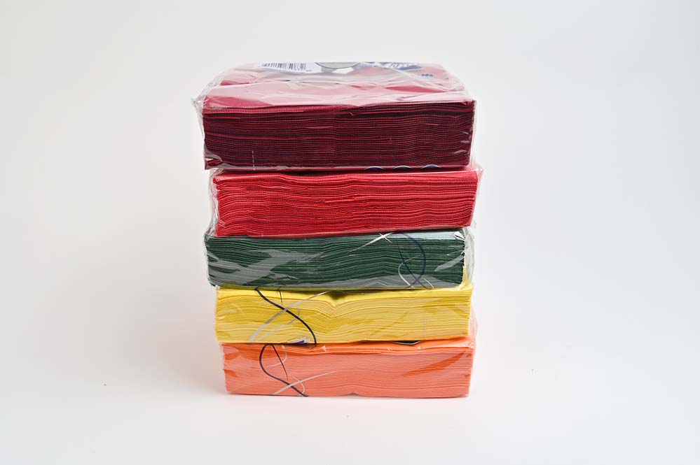 Dvoslojne salvete u boji: bordo, crvena, zelena, žuta, narandžasta (100% celuloza, 33×33 cm, 35 kom) .