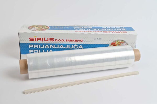 PE streč folija na rolni (250 m / 9 mikrona ) – karontska kutija sa nožićem za lakše isijecanje folije.