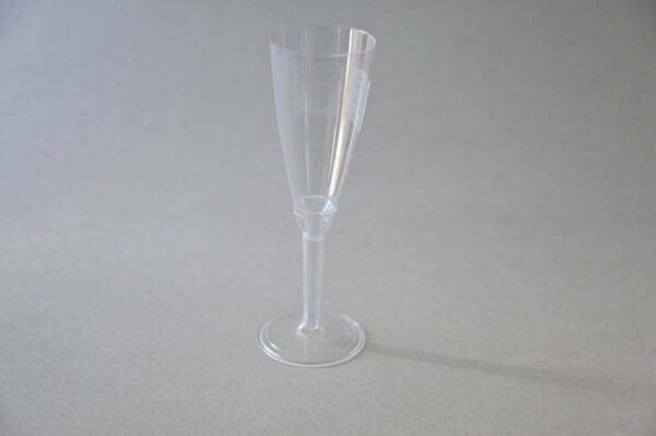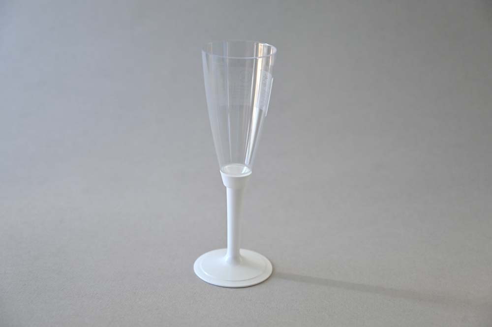 Prozirna čaša – šampanjac 100 ml, odvojeno visoko bijelo / prozirno postolje. Upotreba: catering, zabave, rođendani.